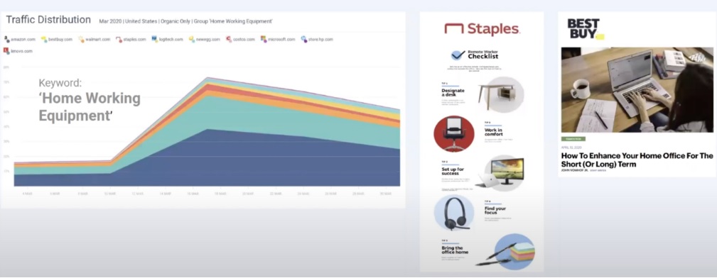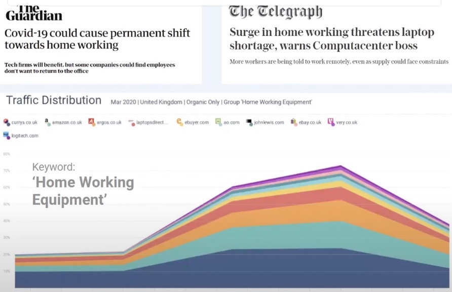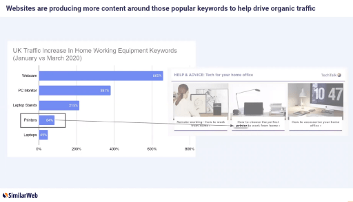To try and capture as much of this traffic as possible we’re seeing an increased number of companies creating dedicated homeworking sections on their website and producing the increased amount of content around specific products. For example, Curry’s PC World has created on its website a section with specific blog posts and articles around recommendations and help and advice around working from home. Companies largely do this to increase their ranking or Google for this kind of popular keywords, which help drive organic traffic to their website from consumers with intent.