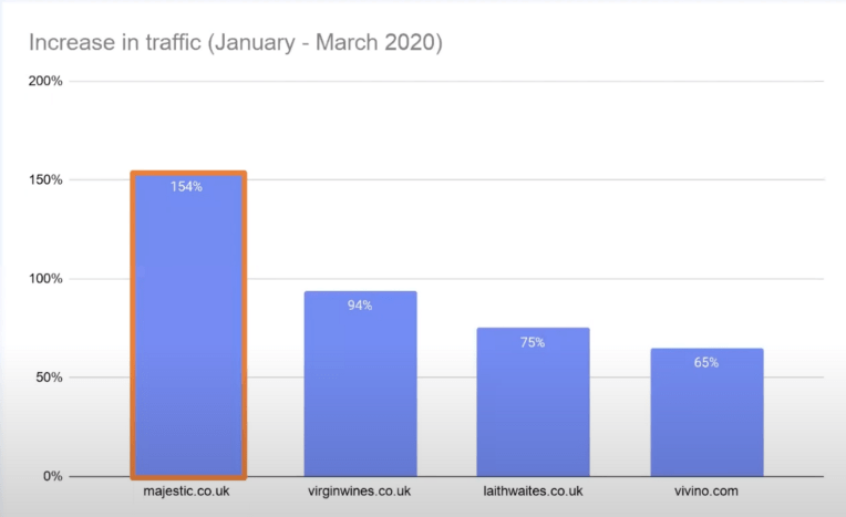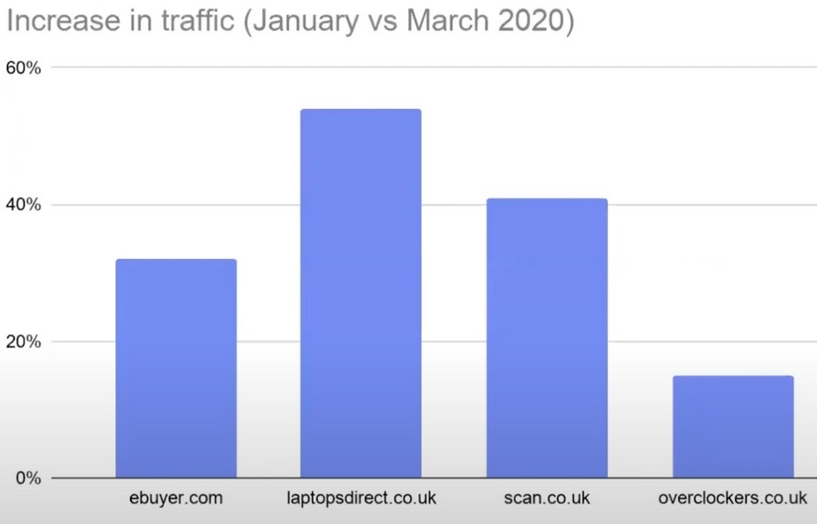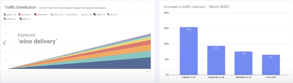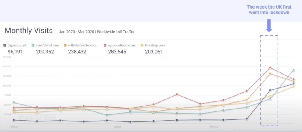 In the graph above there are four examples of niche grocery providers in the UK. It’s easy to spot the point in which the UK went into full lockdown, traffic to these websites soared as consumers were forced to look beyond the big supermarkets, bigbarn.co.uk saw their website traffic growth by staggering 550 percent between January and March.