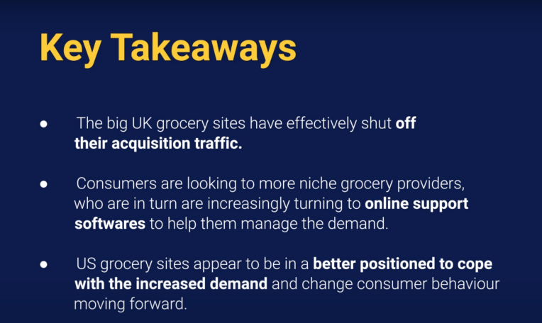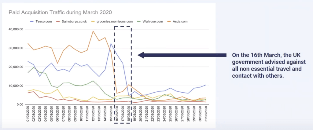 To help cope with increased demand, big supermarket chains in the UK were trying to reduce their customer acquisition by effectively turning off their paid acquisition. Big players in the market struggling to cope with the increased demand more and more consumers are turning to niche grocery providers for their shopping.