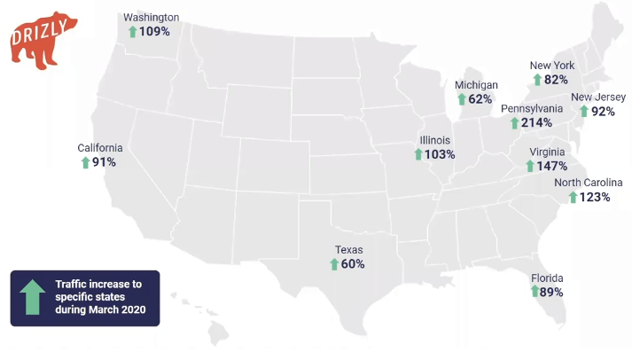 Alcohol delivery wasn’t allowed everywhere in the USA, but because of lockdown, a number of states are temporarily relaxing their laws around that. According to Market Watch, online alcohol sales are up by 243% in March with liquor and spirits sales up by 75% and wine sales up by 66%.