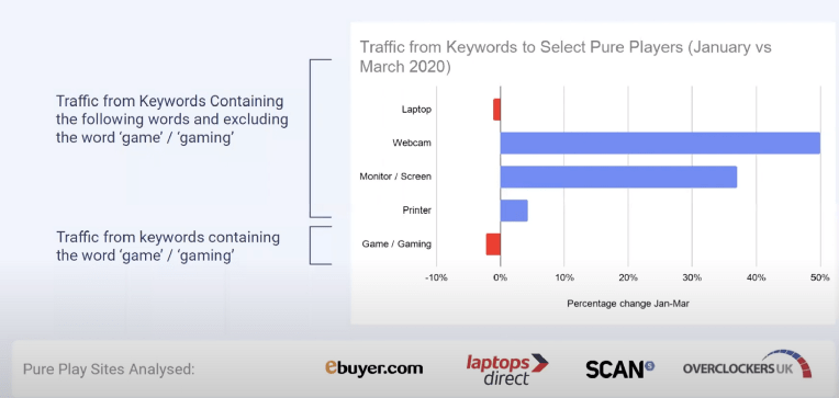 Specialized consumer electronics companies should be making similar moves as home equipment shops. It’s likely these types of companies don’t rank as high on Google as the big players. So to help increase their visibility on Google and win more traffic, a good strategy here would be to run paid search advertising against some of the most popular keywords. The crisis presented golden opportunities for these pure players to become more top of mind when people are searching for consumer electronics equipment, regardless of whether it’s related to home working or not.