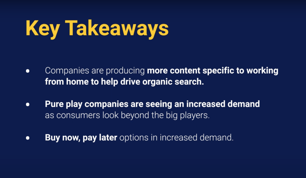 The traditional market leaders are struggling to keep up with the increasing demand for work in-home equipment. Because of this, we’re seeing a lot of growth in the niche pure players within this space, who previously would not have been competing for this kind of customer base and with a lot of these purchases being both expensive and unplanned, consumers are turning to buy now pay later options as they look to spread the cost of these expenditures and make them more manageable.
