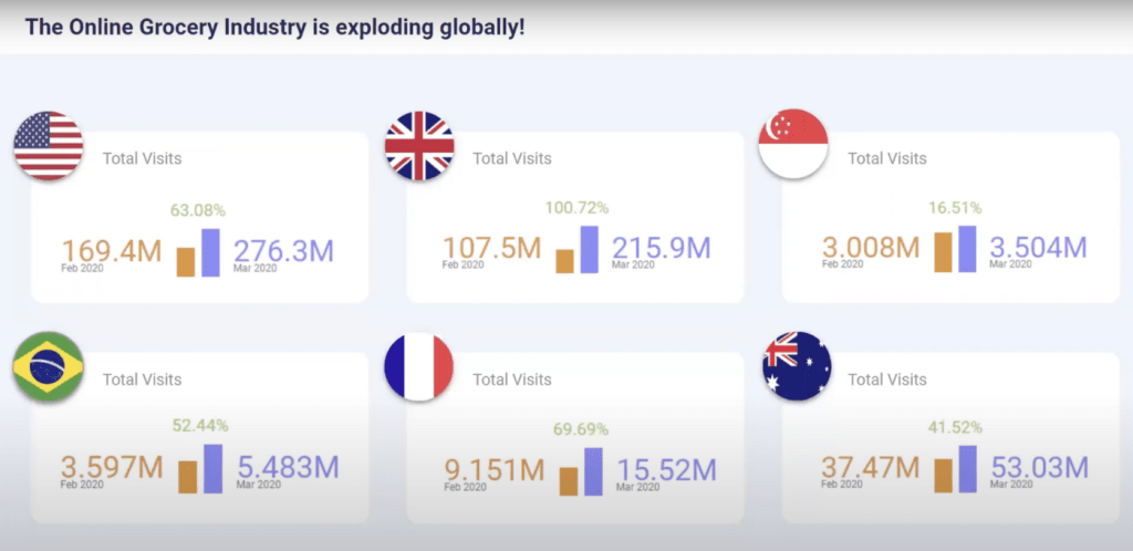Since the recommendations around social distancing and self-isolation, and ultimately lockdowns came into effect, there has been an explosion in the demand for online grocery shopping. UK online grocery players have grown from 87% even up to 232%.