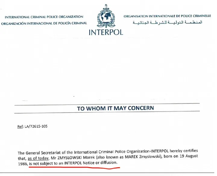 Po osiemnastu miesiącach na liście Interpol Red Notice organizacja usunęła mój wpis i wydała formalne stanowisko że zawiadomienie nigdy nie powinno zostać zgłoszone. Nie miało podstaw i nie spełniało standardów Interpolu.